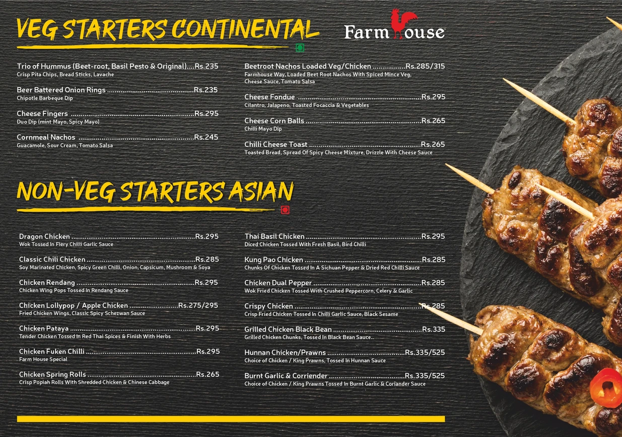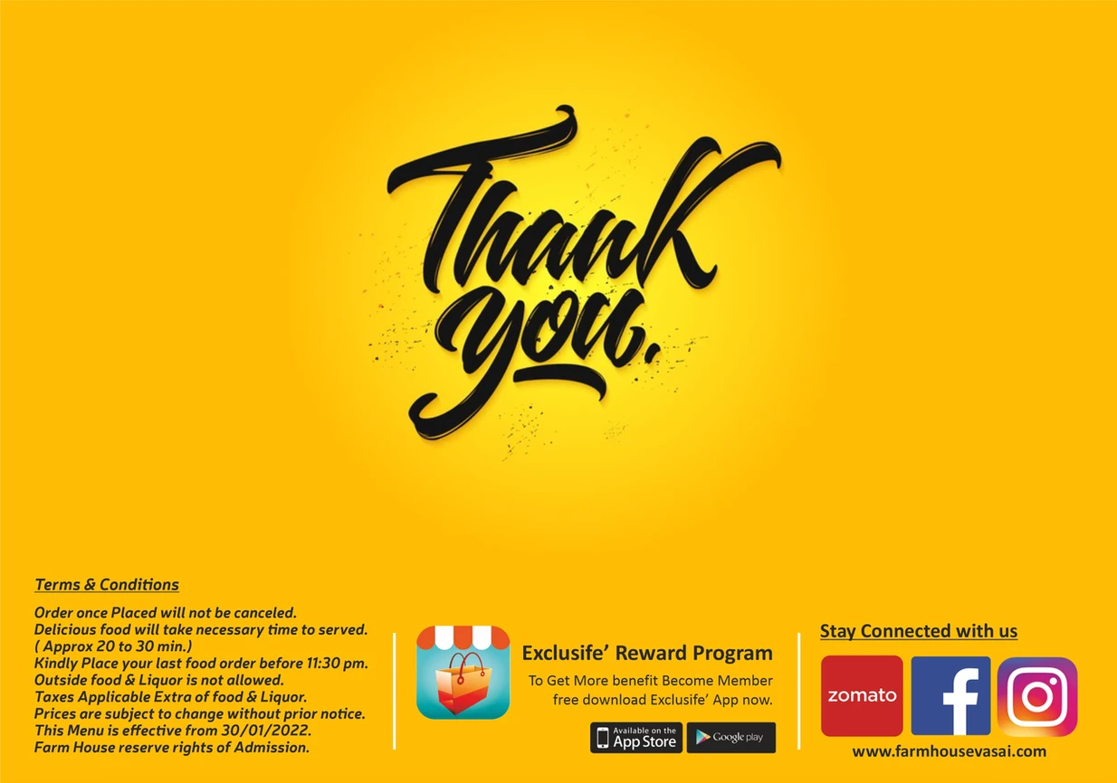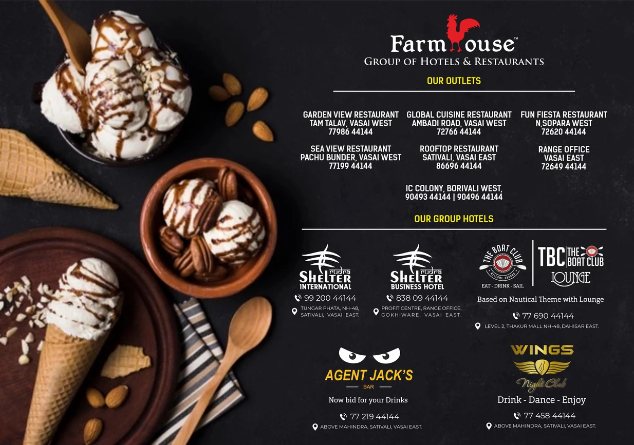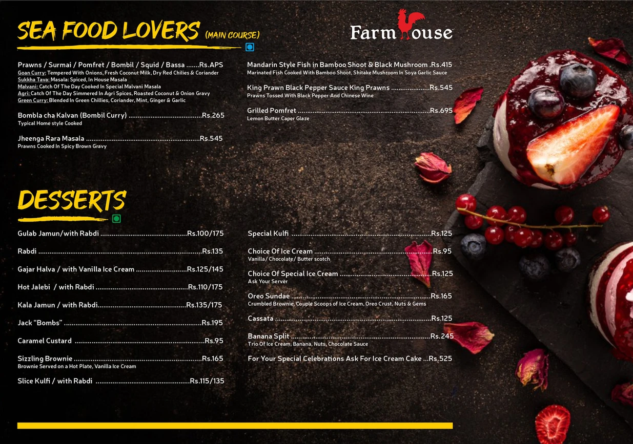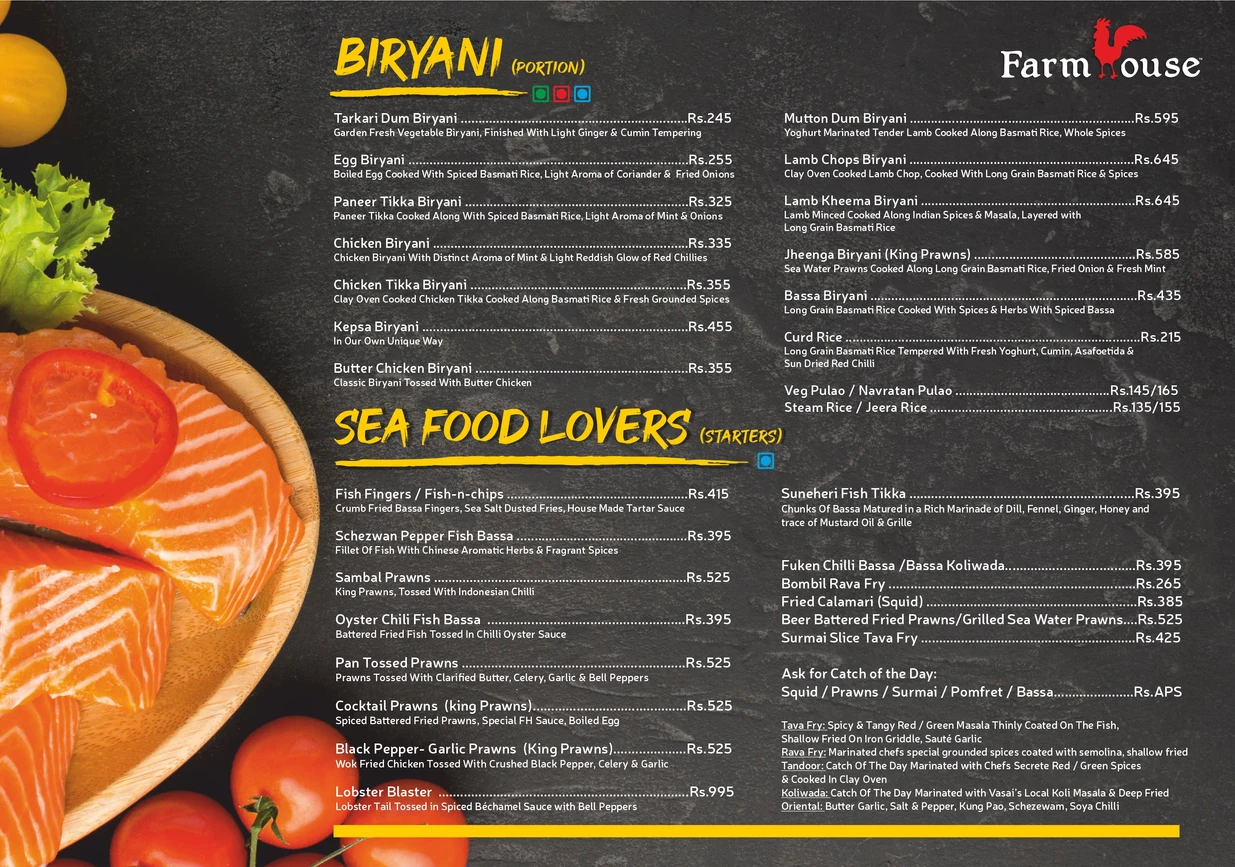 Farmhouse has a variety of foods. We serve multi cuisine and our specialty is sea food.